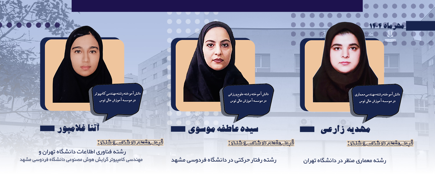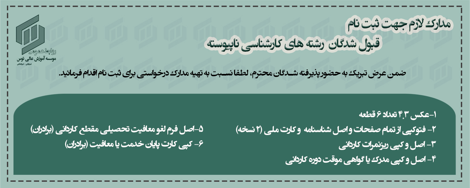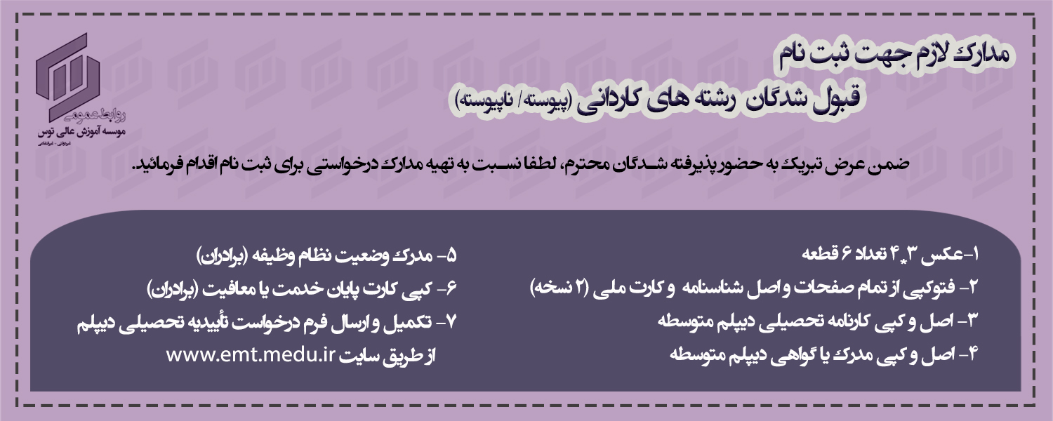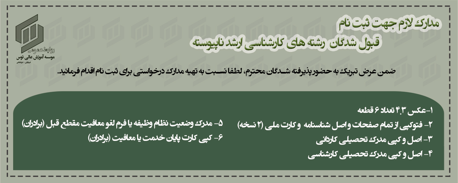 اسلایدر قبولی ارشد copyاسلایدر ثبت نام ارشد copyاسلایدر ثبت نام کارشناسی ناپیوسته copyاسلایدر ثبت نام کاردانی copyاسلایدر اولاسلایدر دوماسلایدر تسهیلات ویژه 2Slide2اسلایدر جشن فارغ التحصیلی 98اسلایدر کنفرانساسلایدر همایش های مشاوره تحصیلیاسلایدر بازدیدهای گروه کامپیوتراسلایدر بازدیدهای گروه عمراناسلایدر بازدید گروه معماریاسلایدر بازدیدهای گروه صنایع ثبت نام دانشجویان جدیدالورود آموزش عالی توس در یک نگاه تسهیلات ویژه ثبت نام پذیرش مقطع کارشناسی پیوسته و ناپیوسته پذیرش در مقطع تحصیلات تکمیلی (کارشناسی ارشد) پرتال اساتید و دانشجویان سیستم یکپارچه پویا اتوماسیون اداری پیوند نامه نگاری اعضای هیئت علمی و کارکنان آموزش مجازی آنلاین LMS کلاس های آموزشی به صورت مجازی ثبت نام دانشجویان جدیدالورود سامانه ثبت نام دانشجویان ورودی جدید فرم ها و کاربرگ ها کلیه فرم ها و کاربرگ ها قسمت های مختلف تحصیلات تکمیلی ویژه دانشجویان مقطع ارشد گزارش های تصویری رویدادها گزارش تصویری جلسه شورای ارتباط با صنعت-۴ مردادماه ۱۴۰۴ گزارش تصویری از آیین گشایش شوراهای مرکزی انجمنهای علمی گزارش تصویری برنامه تفریحی مجموعه سرزمین موجهای آبی-۱۴۰۴/۰۳/۱۹ برگزاری همایش معماران توس بازدید دانشجویان از گروه نرم افزاری پارت- 5 خردادماه 1404 برگزاری جلسه اعضای هیئت مدیره سازمان نظام مهندسی ساختمان خراسان رضوی با مؤسسه آموزش عالی توس(1404/02/21) مراسم تجلیل و بزرگداشت هفته مقام استاد و معلم(سال تحصیلی 1404-1403) عرض تبریک به خانواده توس عرض تبریک به خانواده توس عرض تبریک به خانواده توس گزارش تصویری بازدید علمی از سازمان حمل و نقل ترافیک مشهد گزارش تصویری جلسه شورای فرهنگی اخبار دانشگاه مشاهده همه خبرها هفته وحدت گرامی باد ۱۳ شهریور ۱۴۰۴ پنجشنبه 13 شهریور 1404 هفته وحدت گرامی باد پنجشنبه 13 شهریور 1404 ثبت نام و انتخاب رشته مقطع کارشناسی پیوسته(بدون آزمون) سال ۱۴۰۴ پنجشنبه 30 مرداد 1404 همایش تخصصی رایگان انتخاب رشته و دانشگاه ( ویژه دانش آموزان پایه دوازدهم) چهارشنبه 29 مرداد 1404 تقویم آموزشی نیمسال اول سال تحصیلی 1405-1404 اطلاعیه ها مشاهده همه اطلاعیه ها یکشنبه 16 شهریور 1404 اطلاعیه واریز شهریه علی الحساب نیمسال اول سال تحصیلی ۱۴۰۵-۱۴۰۴ پنجشنبه 13 شهریور 1404 ثبت نام و انتخاب رشته مقطع کارشناسی پیوسته(بدون آزمون) سال ۱۴۰۴ دوشنبه 10 شهریور 1404 شهریه مصوب ورودی ۱۴۰۴-سال تحصیلی ۱۴۰۵-۱۴۰۴ دوشنبه 27 مرداد 1404 اطلاعیه مهلت دفاع از پایان نامه مقطع کارشناسی ارشد چهارشنبه 8 مرداد 1404 ثبت نام دورههای ویژه آموزشی تابستان ۱۴۰۴ چهارشنبه 18 تیر 1404 پذیرش بدون آزمون /با آزمون رشتههای کاردانی فنی وحرفهای ورودی مهرماه۱۴۰۴