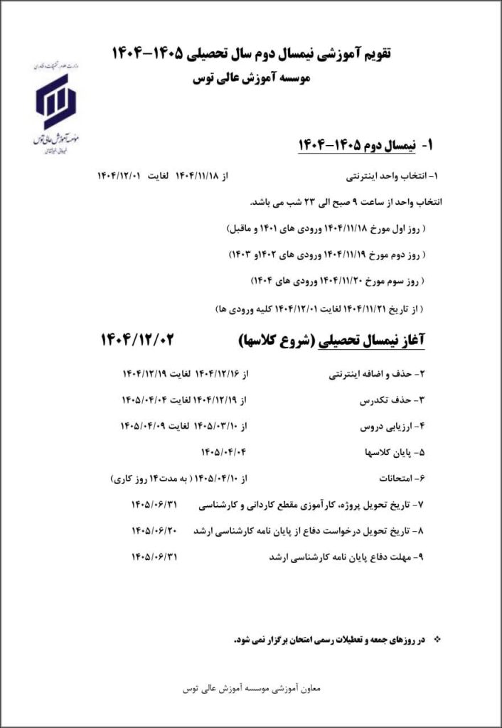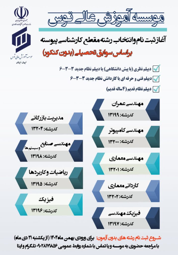 22 بهمن copyدیدار با معاون وزیر copyهفته پژوهش 1404 copyدانشجویان نورورد 1404اسلایدر اولاسلایدر دوماسلایدر تسهیلات ویژه 2Slide2اسلایدر جشن فارغ التحصیلی 98همایش معماران توس copyاسلایدر کنفرانساسلایدر همایش های مشاوره تحصیلیاسلایدر بازدیدهای گروه کامپیوتراسلایدر بازدیدهای گروه عمراناسلایدر بازدید گروه معماریاسلایدر بازدیدهای گروه صنایع ثبت نام دانشجویان جدیدالورود آموزش عالی توس در یک نگاه تسهیلات ویژه ثبت نام پذیرش مقطع کارشناسی پیوسته و ناپیوسته پذیرش در مقطع تحصیلات تکمیلی (کارشناسی ارشد) پرتال اساتید و دانشجویان سیستم یکپارچه پویا اتوماسیون اداری پیوند نامه نگاری اعضای هیئت علمی و کارکنان آموزش مجازی آنلاین LMS کلاس های آموزشی به صورت مجازی ثبت نام دانشجویان جدیدالورود سامانه ثبت نام دانشجویان ورودی جدید فرم ها و کاربرگ ها کلیه فرم ها و کاربرگ ها قسمت های مختلف تحصیلات تکمیلی ویژه دانشجویان مقطع ارشد گزارش های تصویری رویدادها عرض تبریک به خانواده توس عرض تبریک به خانواده توس گزارش تصویری اردوی طبیعت گردی در ییلاق شاندیز-۲۰ آذرماه۱۴۰۴ گزارش تصویری تریبون آزاد به مناسبت روز دانشجو-۱۷ آذرماه ۱۴۰۴ گزارش تصویری سخنرانی دکتر حبشی روز دانشجو-۱۶آذرماه۱۴۰۴ گزارش تصویری از مراسم تکریم روز دانشجو-۱۶آذرماه۱۴۰۴ گزارش تصویری از جلسه تعامل پارک علم وفناوری خراسان رضوی با موسسات آموزش عالی-۱۵ آذرماه۱۴۰۴ گزارش تصویری زیارت گروهی حرم مطهر رضوی-۲۷ آبانماه۱۴۰۴ گزارش تصویری جلسه شورای پژوهشی و شورای ارتباط باصنعت با حضور سرپرست محترم اداره توسعه و ارتباط پارک علم وفناوری خراسان رضوی-۱۹ آبانماه ۱۴۰۴ گزارش تصویری آئین استقبال از دانشجویان نوورود – دوشنبه 5 آبان ماه 1404 گزارش تصویری از روند ثبت نام دانشجویان نوورود مهرماه 1404 اخبار دانشگاه مشاهده همه خبرها تقویم آموزشی نیمسال دوم سال تحصیلی ۱۴۰۵-۱۴۰۴ ۱۴ بهمن ۱۴۰۴ سه شنبه 14 بهمن 1404 تقویم آموزشی نیمسال دوم سال تحصیلی ۱۴۰۵-۱۴۰۴ فایل راهنمای نحوه شرکت در آزمون مجازی سامانه LMS پنجشنبه 18 دی 1404 آغاز ثبت نام و انتخاب رشته مقطع کارشناسی پیوسته با سوابق تحصیلی (بدون کنکور) در بهمنماه ۱۴۰۴ دوشنبه 1 دی 1404 وبینار انقلاب هوش مصنوعی در دانشگاه اطلاعیه ها مشاهده همه اطلاعیه ها شنبه 4 بهمن 1404 فایل راهنمای نحوه شرکت در آزمون مجازی سامانه LMS دوشنبه 1 دی 1404 وبینار انقلاب هوش مصنوعی در دانشگاه جمعه 28 آذر 1404 اطلاعیه تعطیلی روز شنبه ۲۹ آذرماه۱۴۰۴ سه شنبه 25 آذر 1404 اطلاعیه تسویه حساب شهریه نیمسال اول سال ۱۴۰۴-۱۴۰۵ دوشنبه 24 آذر 1404 اطلاعیه ثبت نام در آیین بزرگداشت شب یلدا یکشنبه 23 آذر 1404 💠برنامه سمینار های هفته پژوهش و فناوری موسسه آموزش عالی توس