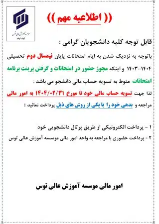 اطلاعیه تسویه حساب شهریه نیمسال دوم سال 1404-1403