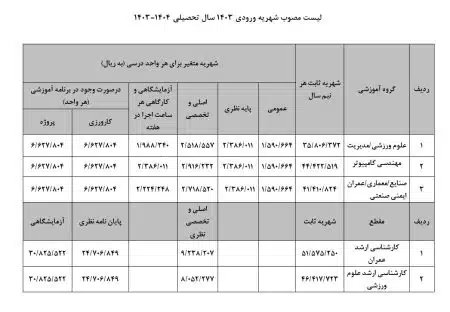 جدول شهریه نیمسال اول سال تحصیلی 1404-1403