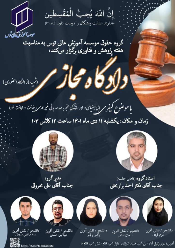 گروه حقوق موسسه آموزش عالی توس به مناسبت هفته پژوهش و فناوری برگزار می کند: دادگاه مجازی(شبیه سلز دادگاه/حضوری) با موضوع کیفری(بی احتیاطی در امر رانندگی منجر به صدمه بدنی…