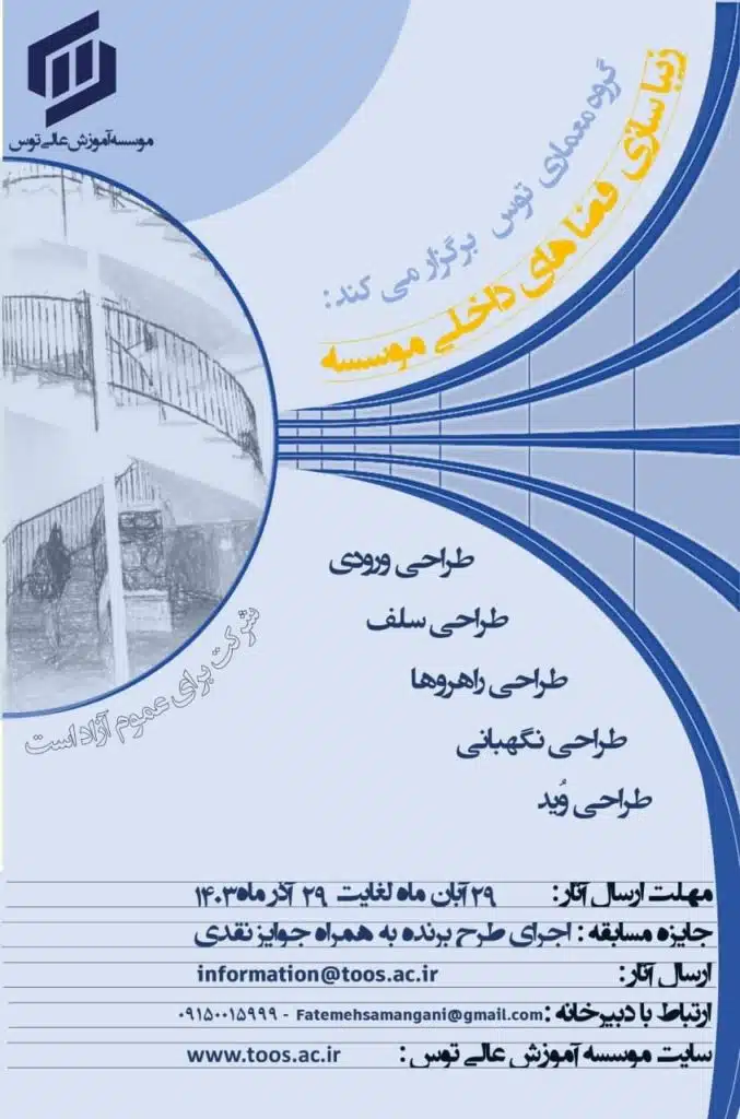 گروه معماری مؤسسه آموزش عالی توس برگزار می کند: مسابقه زیباسازی فضاهای داخلی دانشگاه طراحی ورودی طراحی سلف طراحی راهروها طراحی نگهبانی طراحی وید مهلت ارسال آثار: تا 29 آذرماه…