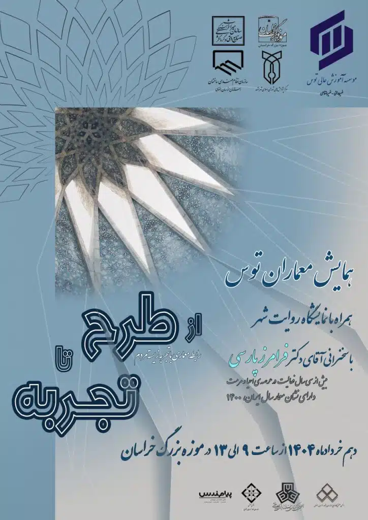 💠گروه معماری و دفتر ارتباط با صنعت موسسه آموزش عالی توس برگزار می‌نماید: همایش معماران توس «از طرح تا تجربه» به همراه نمایشگاه آثار برتر 🔹سخنرانی آقای دکتر فرامرز پارسی…