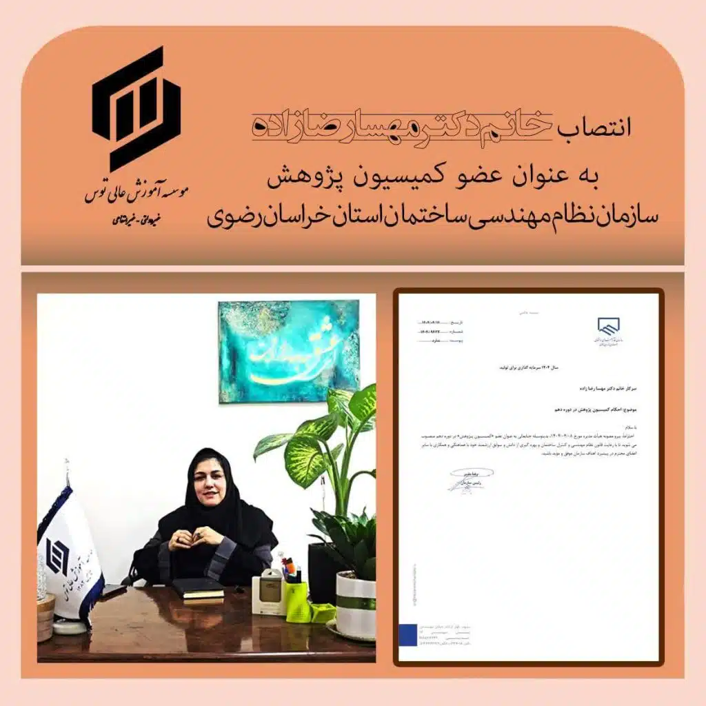 💠عرض تبریک سرکارخانم دکتر مهسا رضازاده، مدیر محترم ارتباط با صنعت و مدیر محترم گروه مهندسی معماری موسسه آموزش عالی توس، انتصاب سرکارعالی با عنوان: عضو کمیسیون پژوهش دوره‌ی دهم…