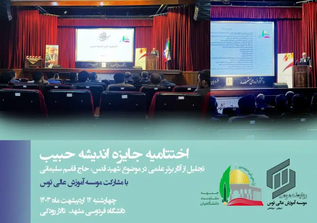 مراسم اختتامیه جایزه اندیشه حبیببامشارکت موسسه آموزش عالی توس 💠تجلیل از مؤلفان آثار برتر علمی در موضوع شهید قدس، حاج قاسم سلیمانی 💠جبهه مقاومت دانشگاهیان؛ ترویج کنندگان مکتب شهید سلیمانی…