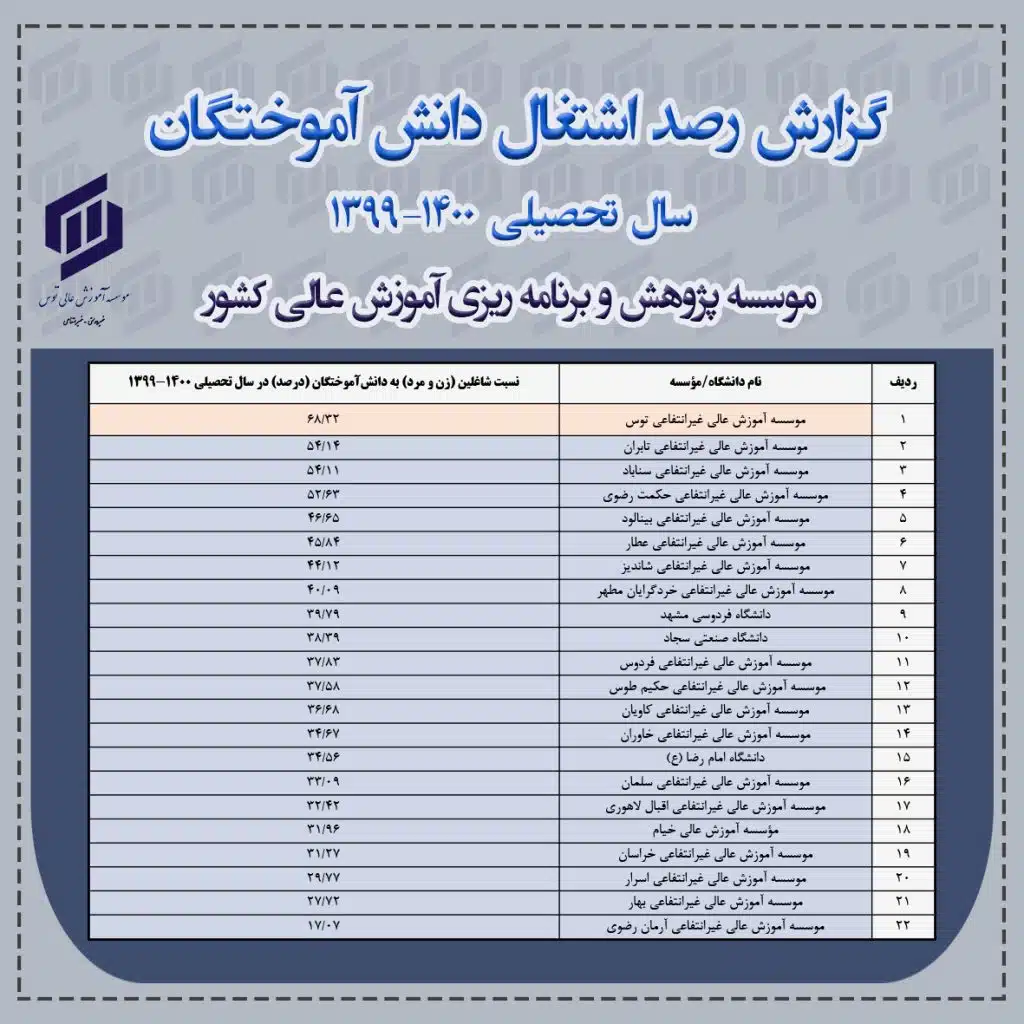 موسسه آموزش عالی توس با ۶۸/۳۲ درصد دارای بیشترین درصد اشتغال دانشآموختگان از بین دانشگاه و موسسات مشهد میباشد. تبریک به خانواده موسسه آموزش عالی توس (این گزارش…