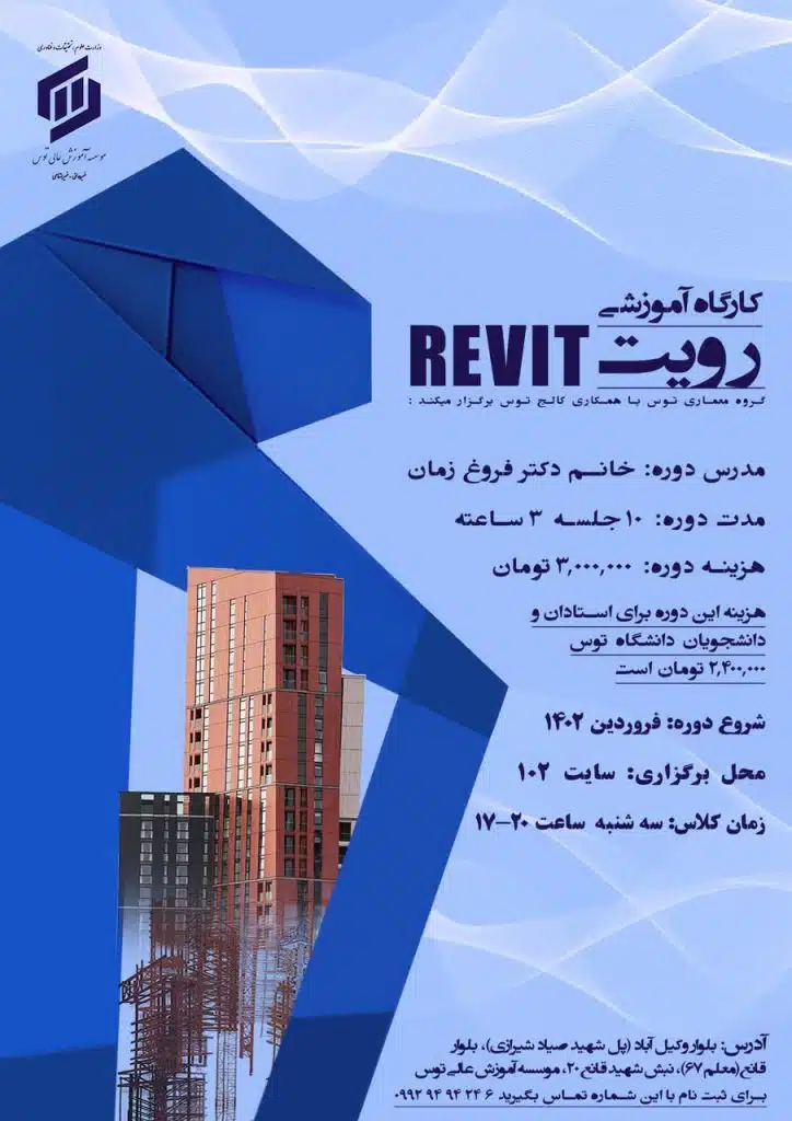 گروه معماری موسسه آموزش عالی توس با همکاری کالج موسسه برگزار می کند: کارگاه آموزشی “رویت” REVIT توضیحات بیشتر دوره و نحوه ثبت نام در پوستر جهت کسب اطلاعات بیشتر…