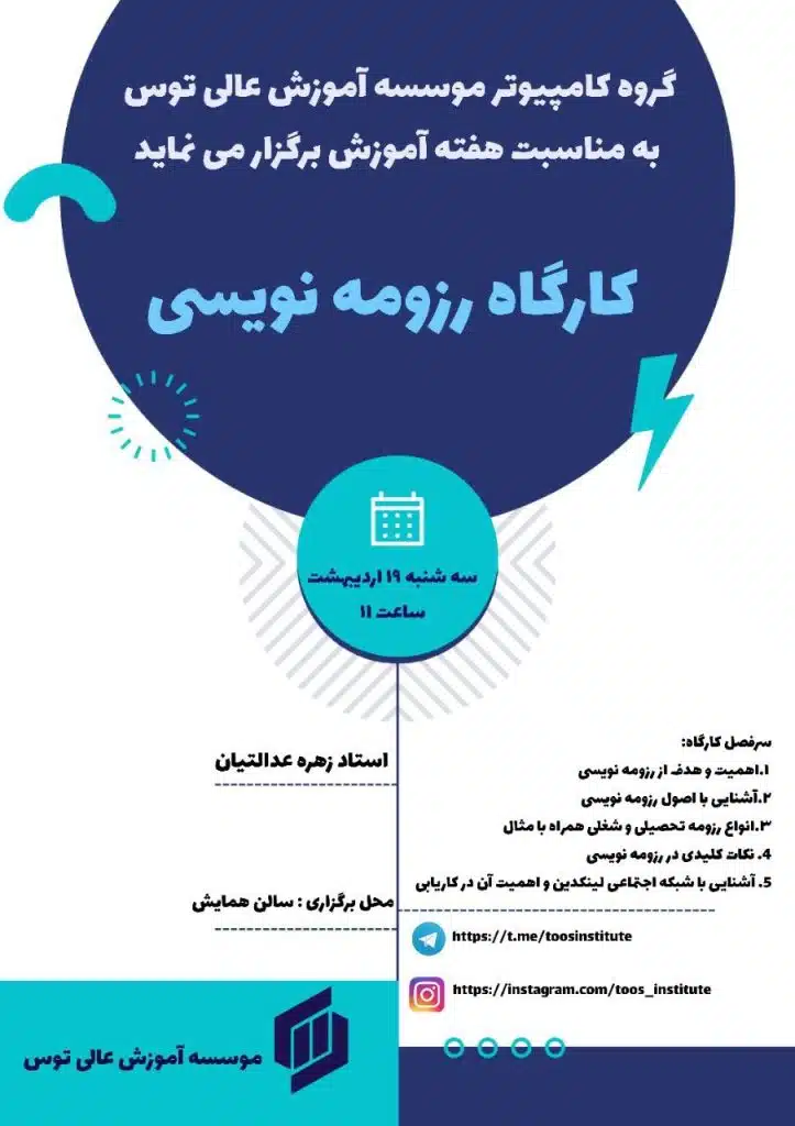 گروه کامپیوتر موسسه آموزش عالی توس به مناسبت هفته آموزش برگزار می کند: کارگاه رزومه نویسی استاد: سرکارخانم عدالتیان مورخ: سه شنبه 19 اردیبهشت ماه 1402 ساعت 11 صبح سالن…