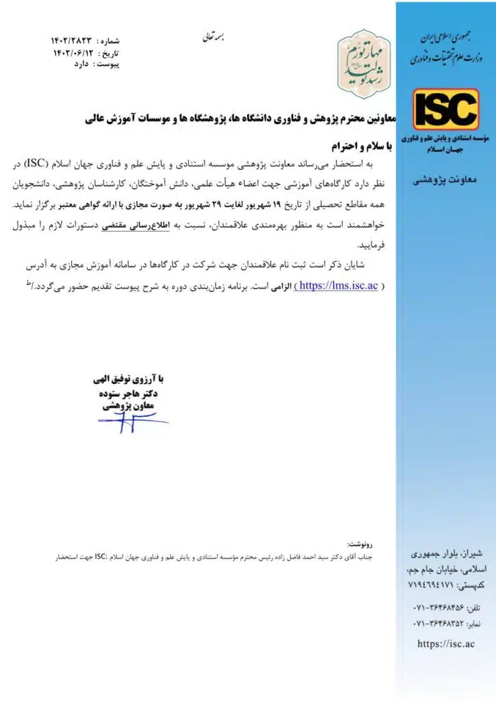 قابل توجه کلیه اعضای محترم هیات علمی، اساتید گرامی و دانشجویان عزیز :چارت کارگاه های تابستان موسسه استنادی و پایش علم و فناوری جهان اسلام ISC جهت اطلاع ارسال می…