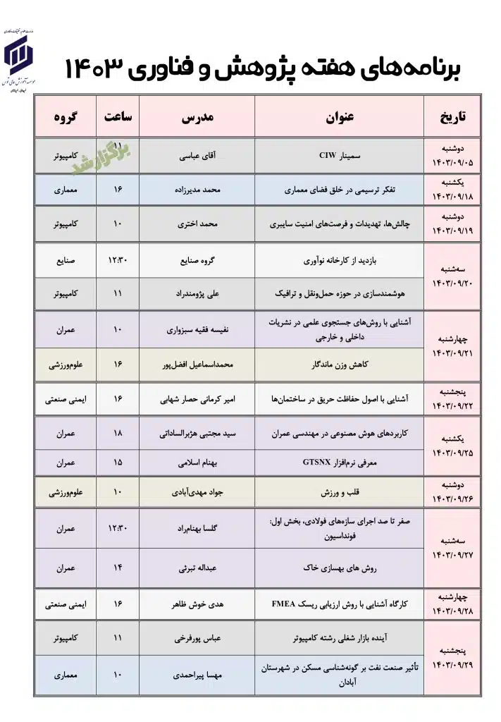 💠برنامه سخنرانی های گروه کامپیوتر به مناسبت هفته پژوهش 🔹آذرماه ۱۴۰۳ (گروه کامپیوتر موسسه آموزش عالی توس)