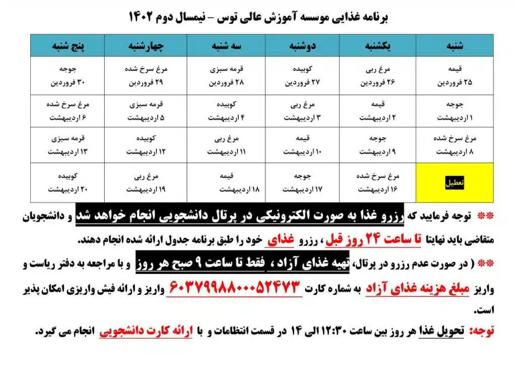 🌺 فعال سازی رزرو غذا برای دانشجویان محترم جهت نیمسال اول سال ۱۴۰۲ 🌺 ✅ به اطلاع می رساند دانشجویان متقاضی می بایست برای رزرو غذای هفتگی خود با مراجعه…